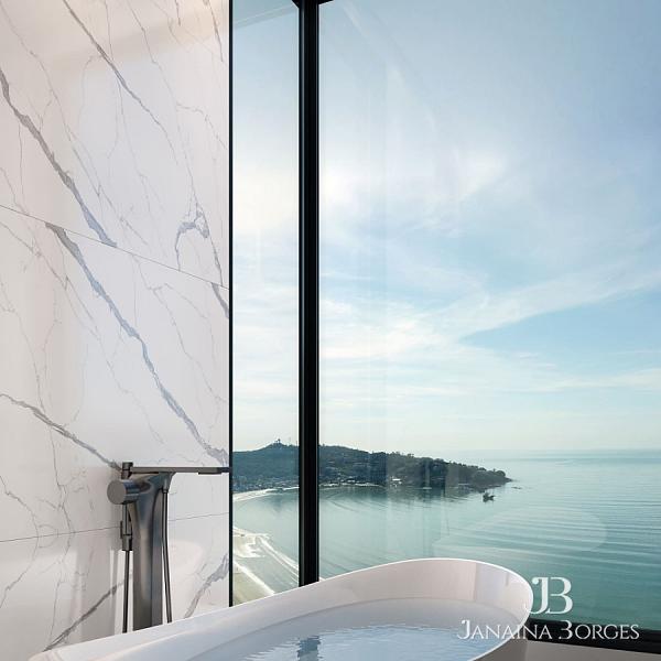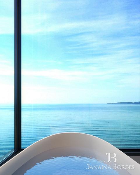 Suíte master com banheira e vista total para o mar