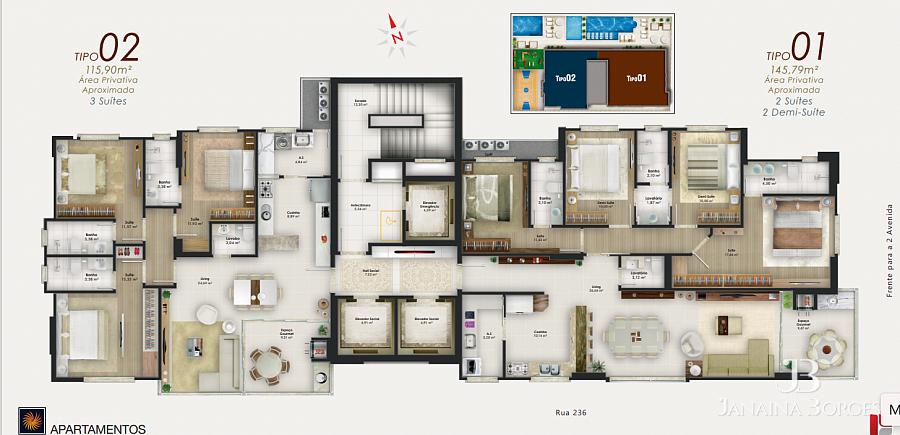 • 4 suítes, sendo 2 demi (145,79m² privativos)