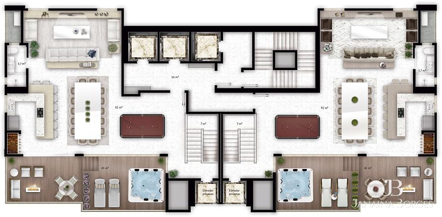 41º Andar (festa): Cozinha americana com churrasqueira, living com sala de estar, jantar e jogos, banheiro, terraço com banheira.